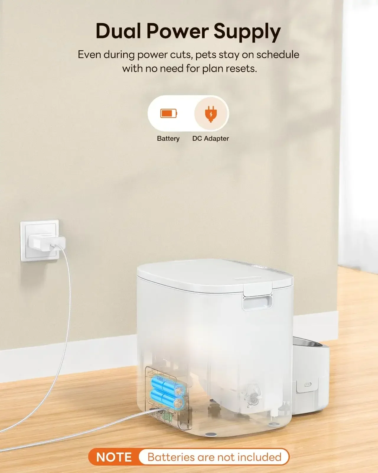 Durable Design for Enduring Performance:The Automatic pet feeder use the 5V DC adapter while supply the auto dog feeder via 4 alkaline D-cell batteries(not included) installed in case of power outages, ensure that your pet gets food consistently. And we are equipped with a chew-proof nylon cable that will not malfunction and cause power outages due to pet bites.