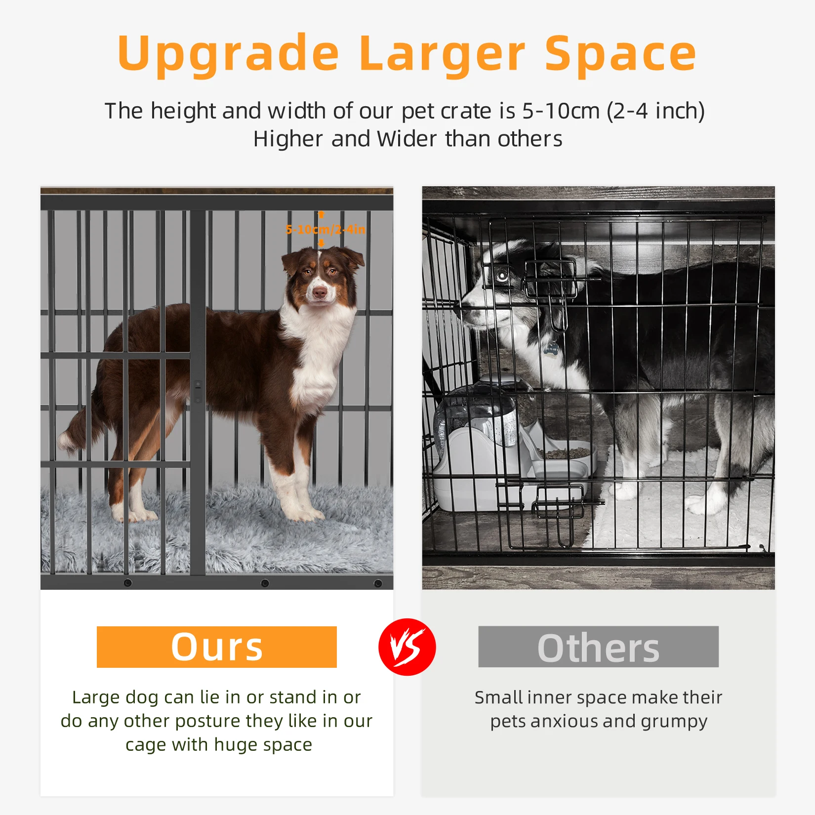 【Durable Dog Kennel】The pet dog crate is well crafted from thicker heavy metal wires, which features high strength and durability than the thin wire, resistant to deform and destroy, rounded iron tubes design are more resistant to bite than thin ones, the top is made of solid MDF board with beautiful wood grain, supports a weight of 88lbs – 132lbs, water-based paint surface, wipes it clean easily
