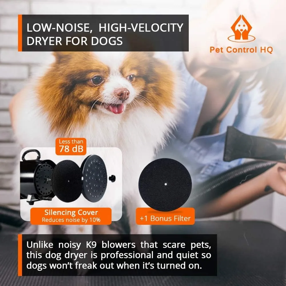 Professional dog grooming dryer: The first touch of the solid metal body and case will tell you that this dog hair dryer is built for daily dog grooming use on large dogs and thickest of undercoats. Unlike noisy K9 blowers that scare pets, this dog grooming blower is a quiet pet hair dryer (less than 78 dB)
