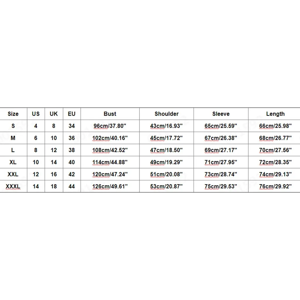 | Size | US | UK | EU | Bust | Shoulder | Sleeve | Length |